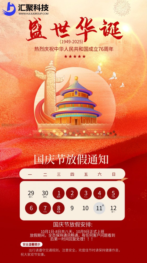 關(guān)于我司2025年國慶節(jié)放假做如下: 一、放假時間: 10月1 日(周三) 至10月8日(周三)放假,共計8 天。 10月9日(周四)正常上班。 二、注意事項(xiàng): 1.請大家做好節(jié)前工作安排,放假期間保持手機(jī)暢通,有任何客戶問題第一時間回復(fù)處理! 祝大家國慶節(jié)快樂!